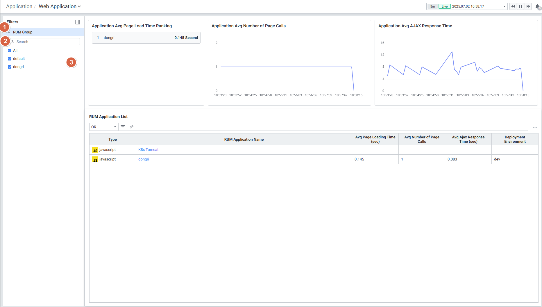 | 1 | RUM Group | RUM 하위의 필터 항목을 보여줍니다. 클릭 시 하위의 필터 항목이 접힙니다. |