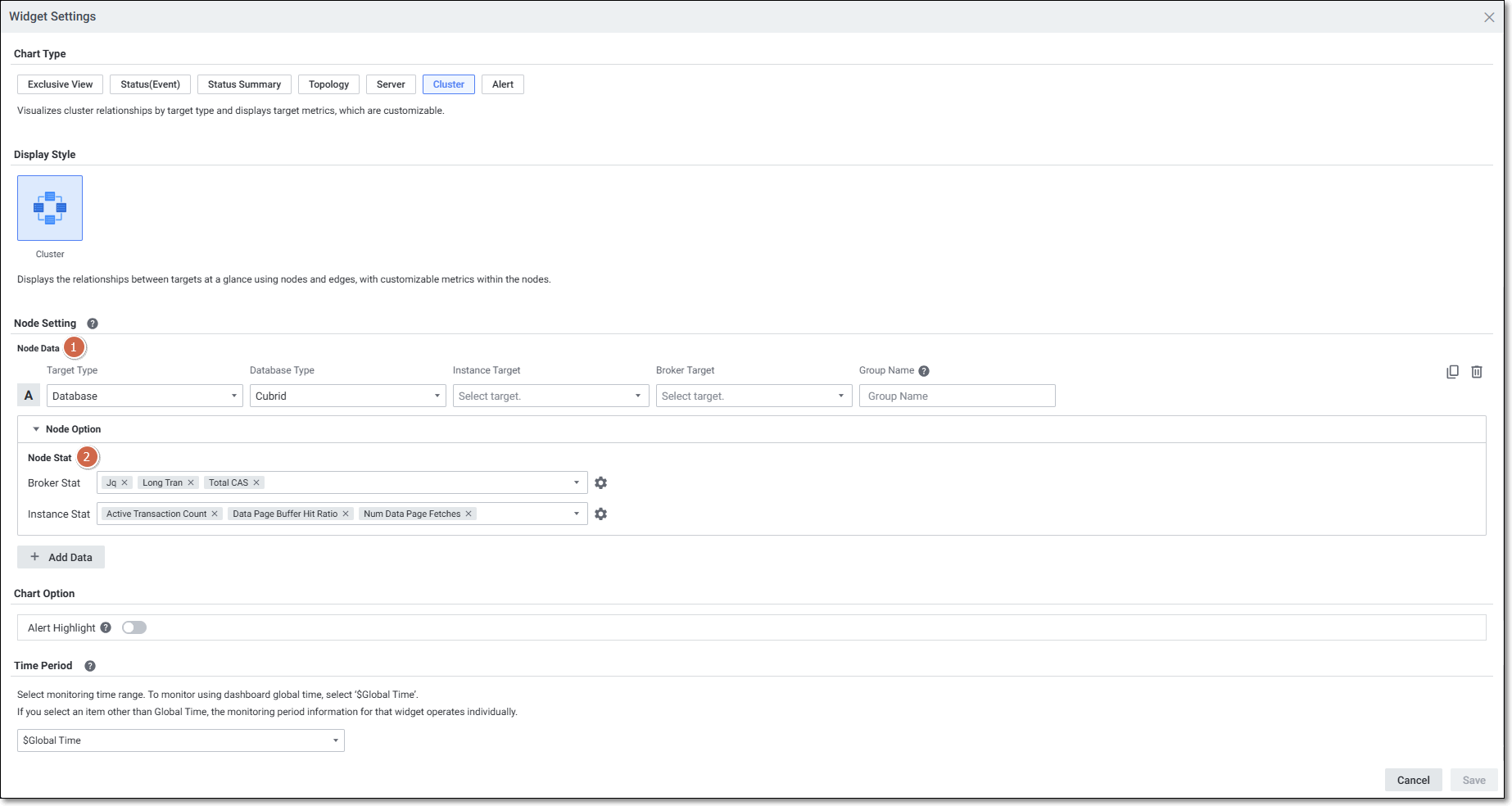 Cluster Widget을 설정하는 화면입니다. 해당 위젯에 특화된 기능만 기재되어 있습니다. 공통 기능은 Widget Setting Common UI를 참고하세요.