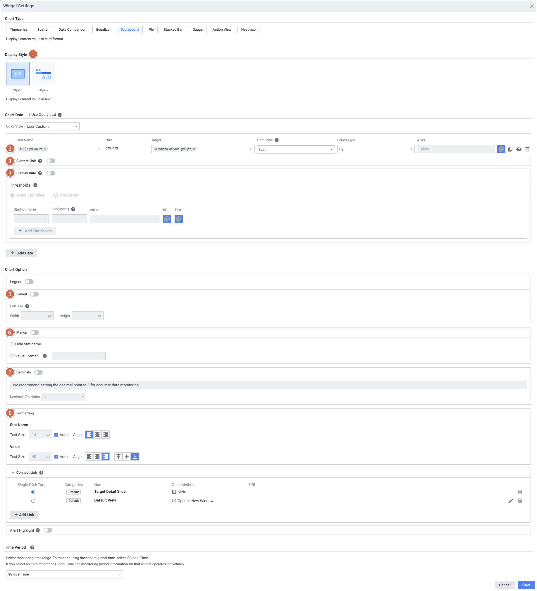 Scoreboard Widget을 설정하는 화면입니다. 해당 위젯에 특화된 기능만 기재되어 있습니다. 공통 기능은 Widget Setting Common UI를 참고하세요.