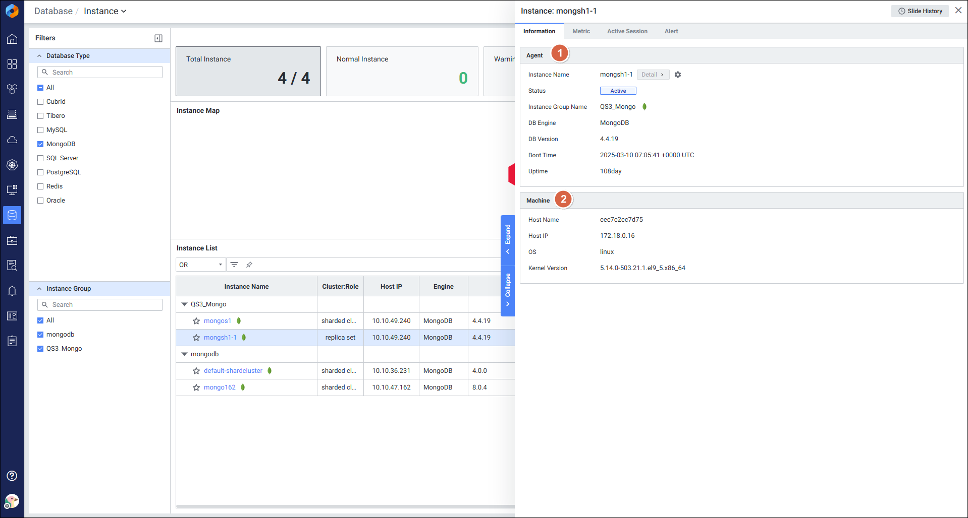 Instance Detail Slide(MongoDB)의 Information을 확인하는 화면입니다.