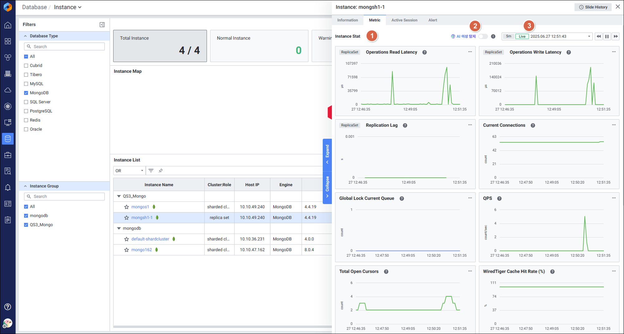 Instance Detail Slide(MongoDB)의 Metric을 확인하는 화면입니다.