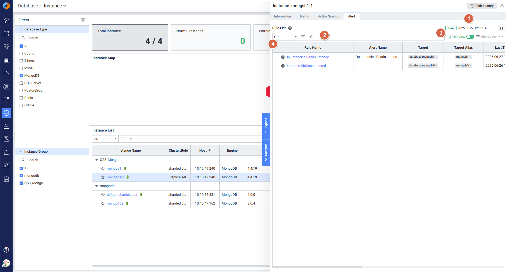 Instance Detail Slide(MongoDB)의 Alert를 확인하는 화면입니다.