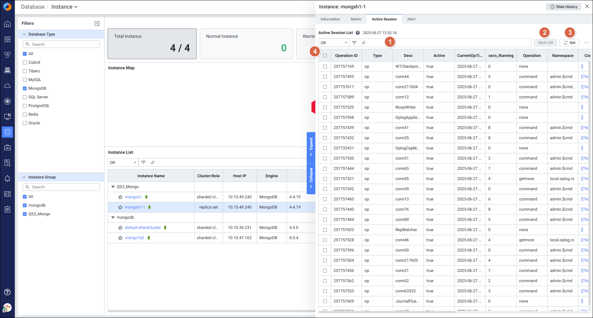 Instance Detail Slide(MongoDB)의 Active Session을 확인하는 화면입니다.