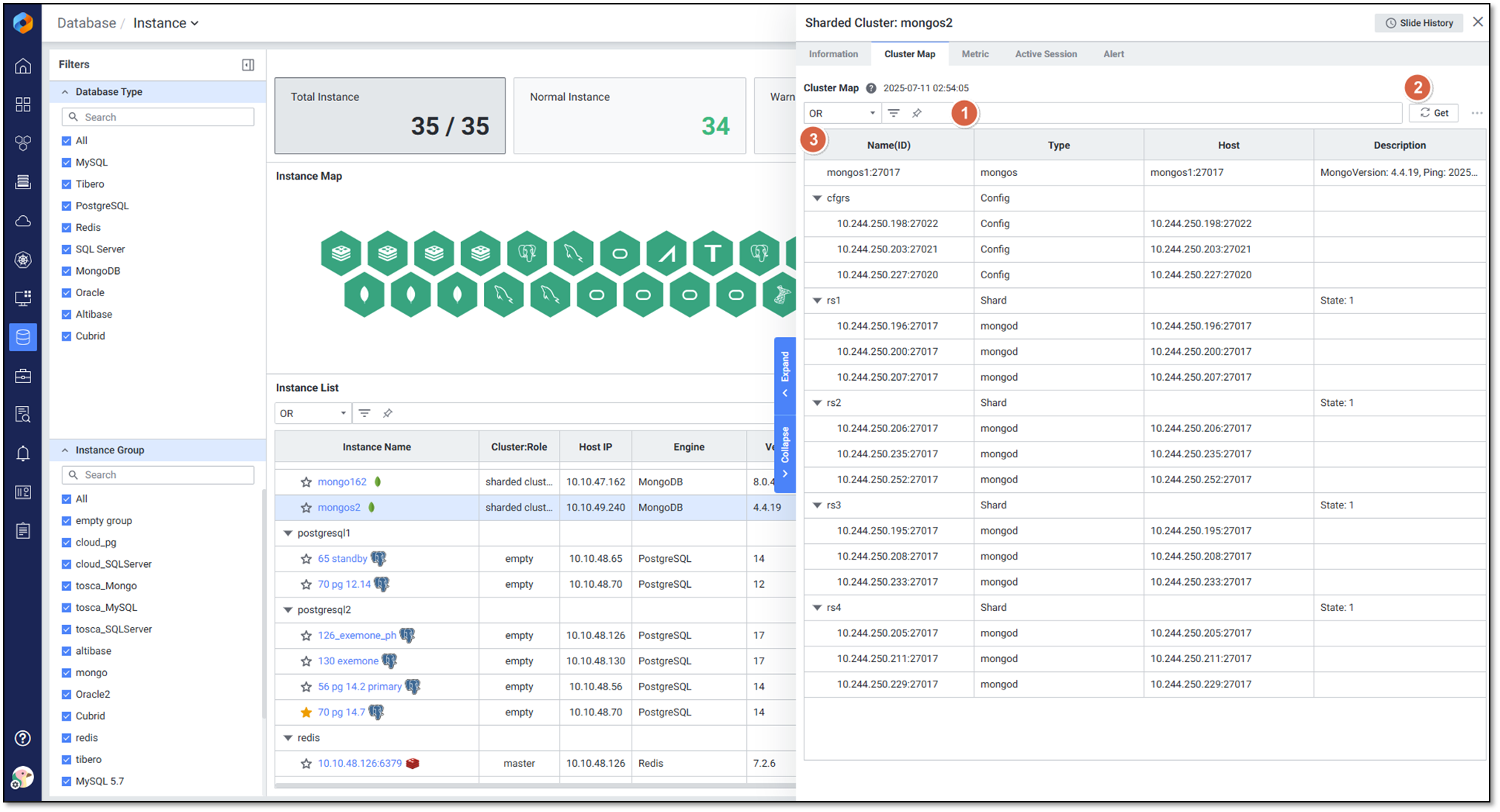 Instance Detail Slide(MongoDB)의 Sharded cluster 상태를 확인하는 화면입니다.