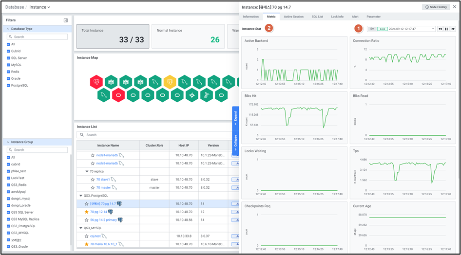 Instance Detail Slide(PostgreSQL)의 Metric을 확인하는 화면입니다.