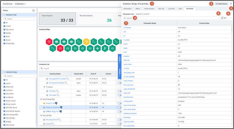 Instance Detail Slide(PostgreSQL)의 Parameter를 확인하는 화면입니다.