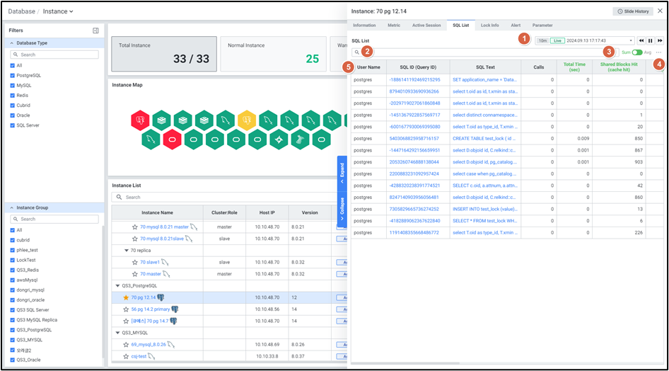 Instance Detail Slide(PostgreSQL)의 SQL List를 확인하는 화면입니다.
