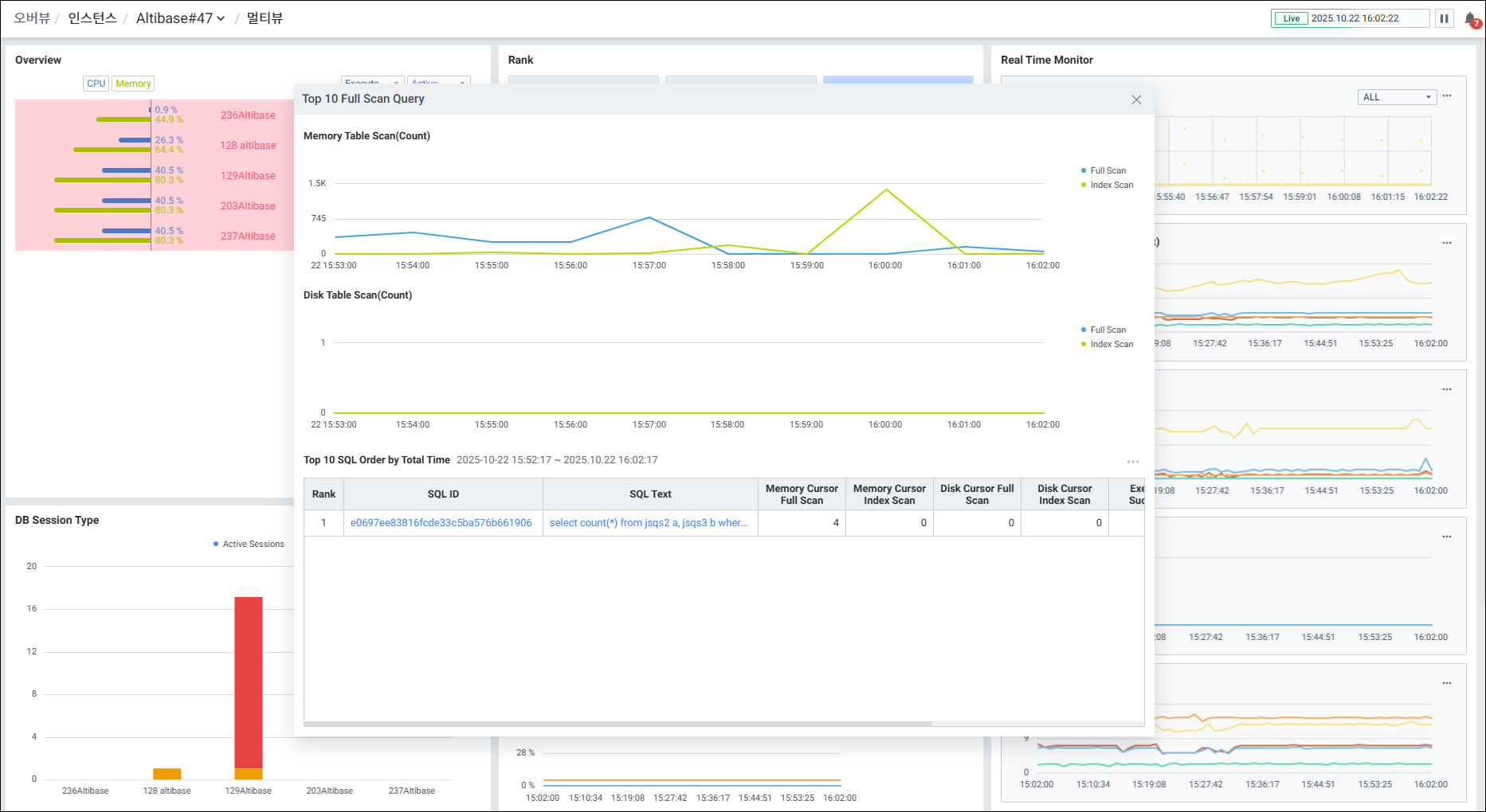 인스턴스 별 Full Scan 수행 비율 순위를 보여줍니다. 인스턴스 클릭 시 Memory 및 Disk Table Scan 수와 Query를 확인할 수 있는 "Top 10 Full Scan Query" 팝업 창으로 연계됩니다.