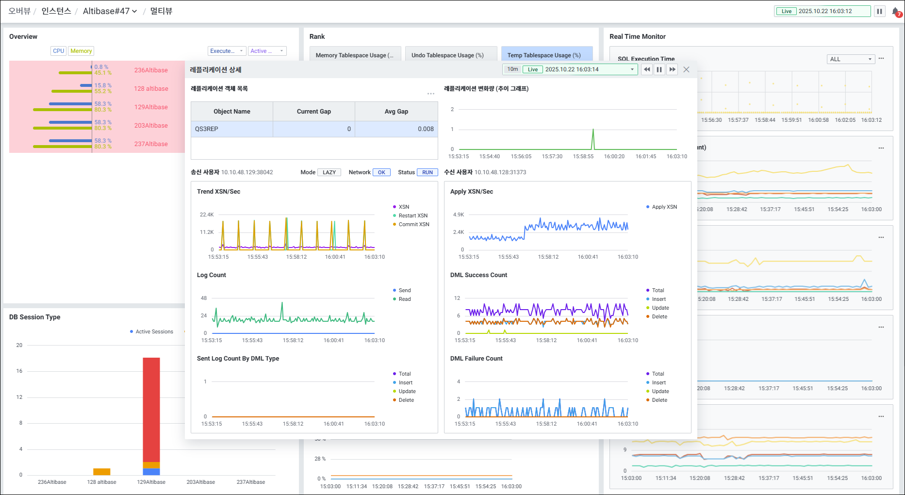 데이터베이스의 활동성 및 지연에 관한 지표들을 이용하여 Chart 형식의 모니터링 화면을 제공합니다.