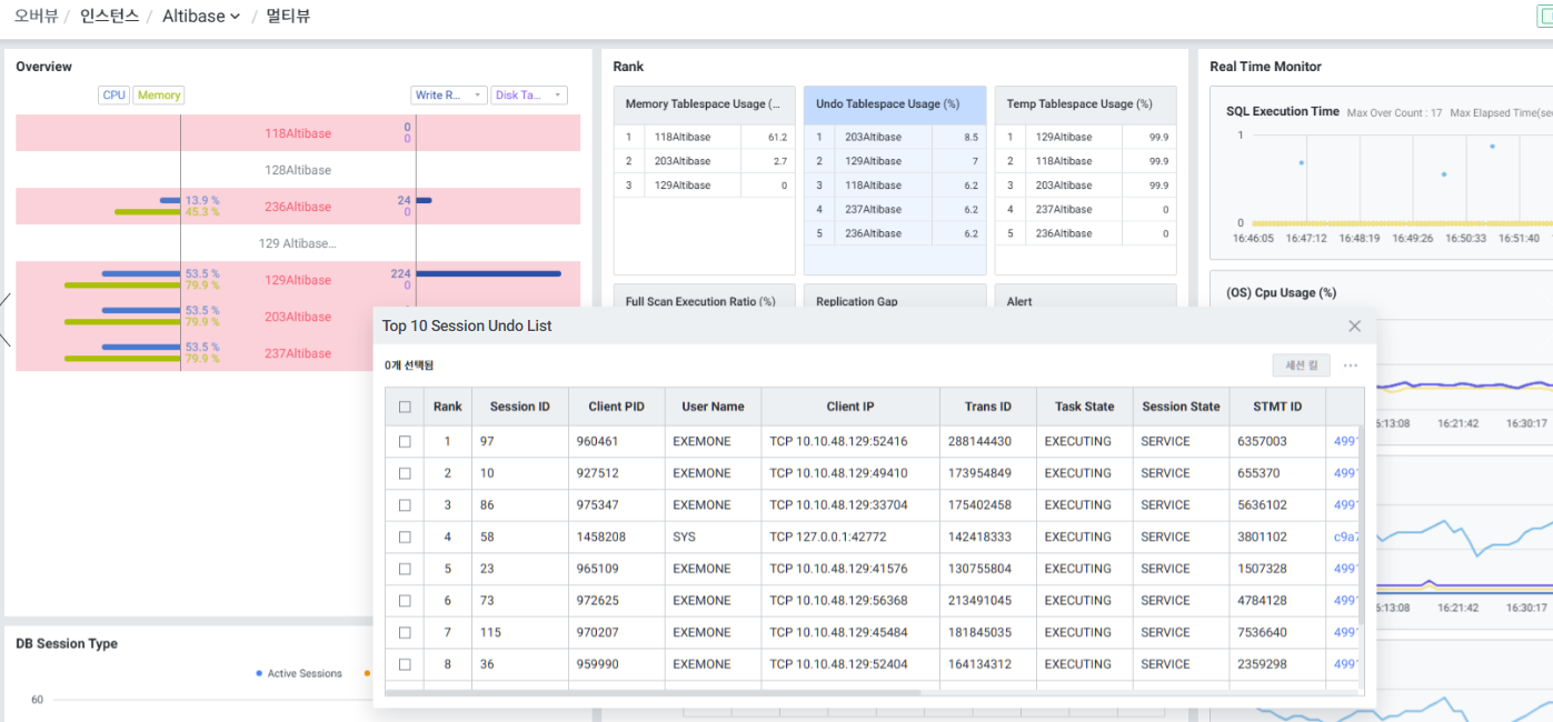 인스턴스 별 Undo Tablespace 사용률 순위를 보여줍니다. 인스턴스 클릭 시 Session Undo Used를 확인할 수 있는 "Top 10 Session Undo List" 팝업 창으로 연계됩니다.