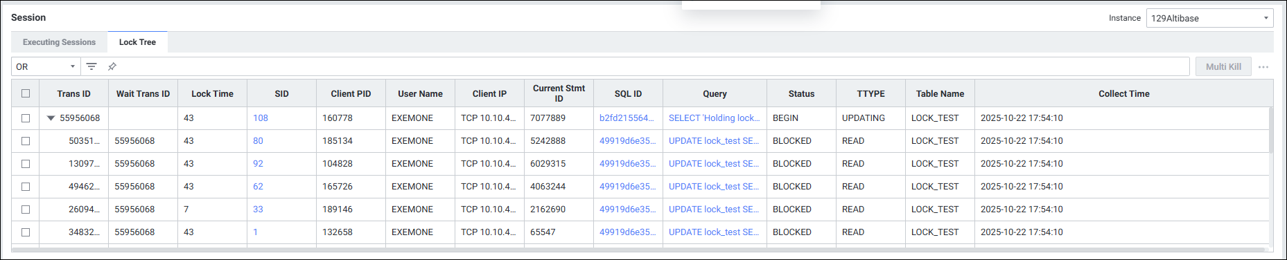 Lock 상태의 Session 목록을 확인할 수 있습니다. 멀티 데이터베이스 모니터링을 지원하며 우측 상단에서 원하는 인스턴스만 모니터링이 가능하도록 선택할 수 있습니다.