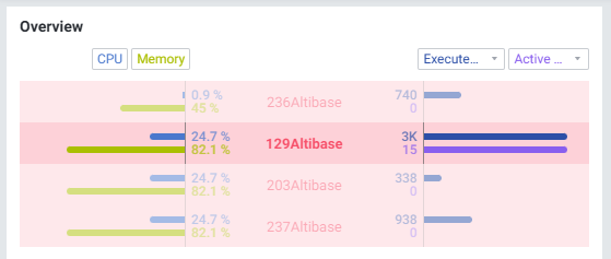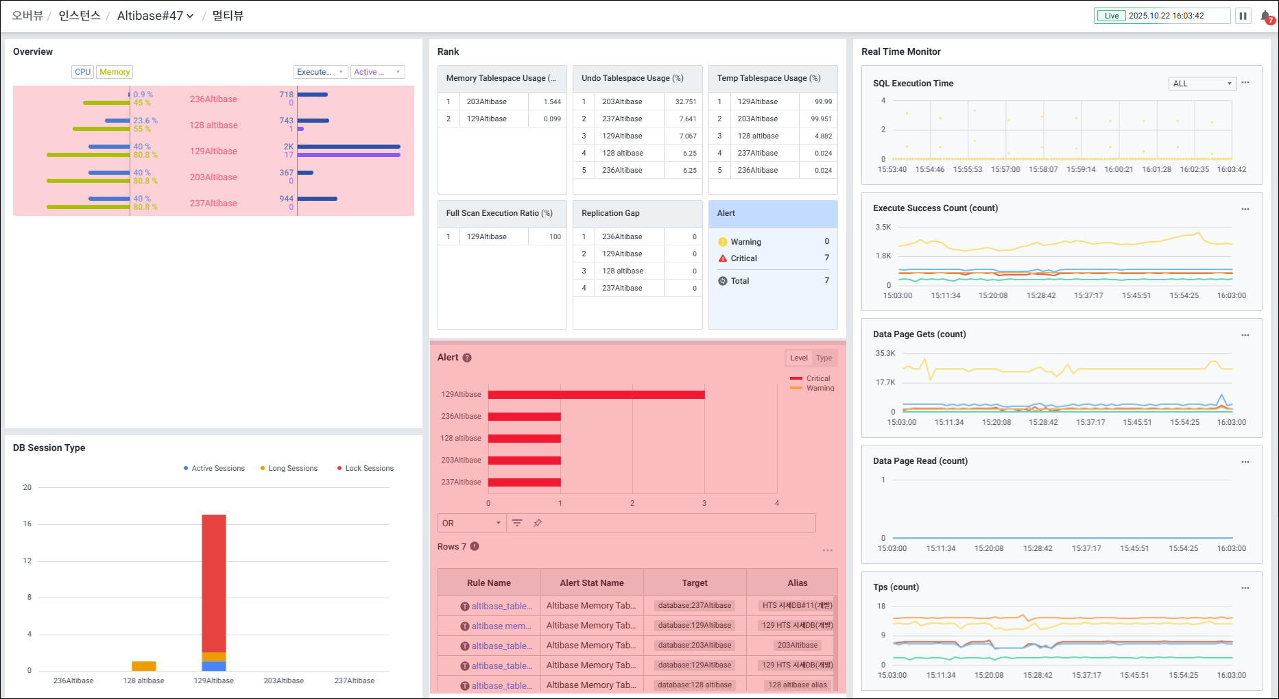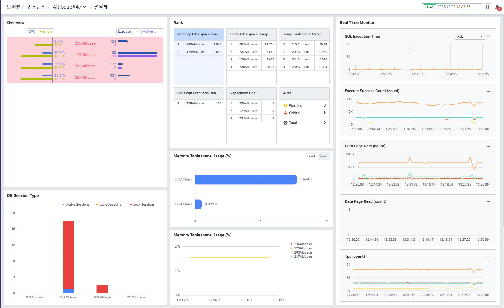 다수의 Altibase 서버를 모니터링 할 수 있는 화면입니다. 하나의 데이터베이스가 선택되면 Overview, Session 등 선택된 데이터베이스의 데이터만으로 변경되어 단일 데이터베이스에 대한 집중적인 모니터링이 가능합니다. 상단 Breadcrumb을 이용하여 Altibase 그룹 변경이 가능합니다.