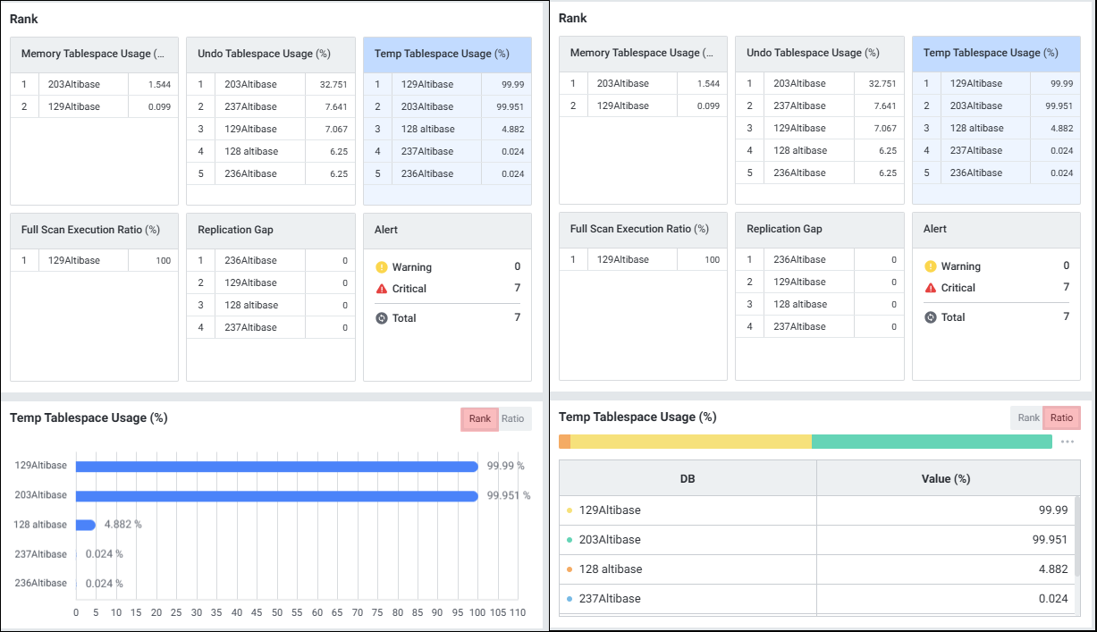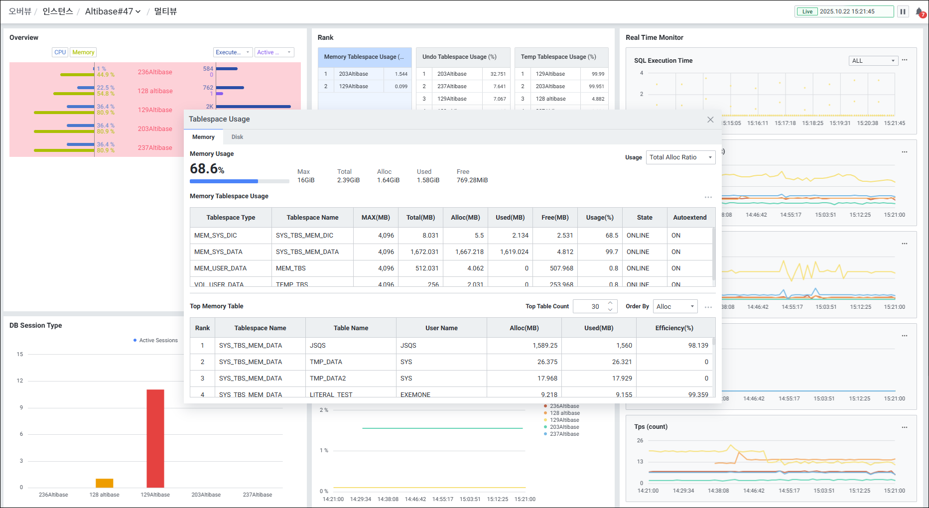 Memory Tablespace 사용률을 보여줍니다. 인스턴스 클릭 시 Memory 및 Disk Tablespace 사용률과 사용률이 높은 Tablespace을 확인할 수 있는 "Tablespace Usage" 팝업창으로 연계됩니다.