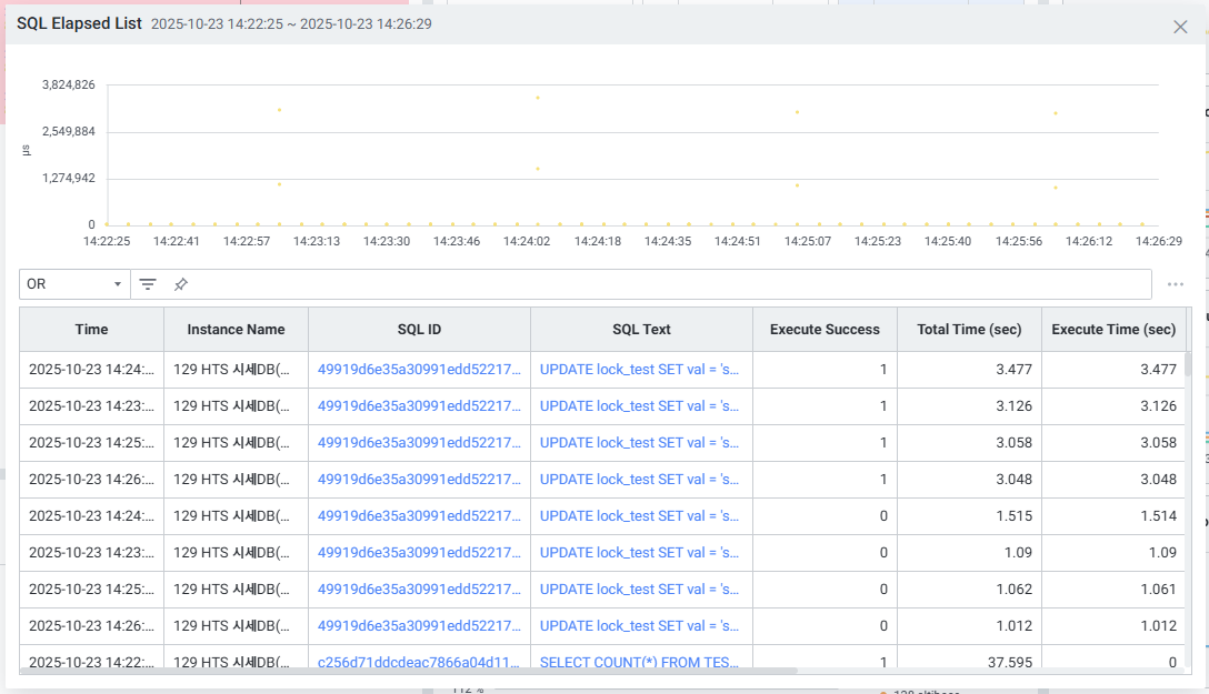 SQL의 수행시간을 Scatter 차트로 확인할 수 있습니다. 등록된 인스턴스들의 Slow Query를 확인하거나 특정 인스턴스를 선택해서 확인할 수 있습니다.)