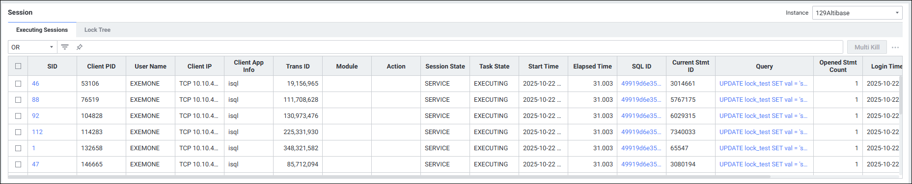 Muli View 화면 하단에서 Executing Session 및 Lock Session 목록을 확인할 수 있습니다. Overveiw나 Trend Chart를 통해 데이터베이스의 비정상적인 상태를 인지했을 때, Session에서 현재 SQL을 실행하고 있는 Executing Session, Lock Session 정보를 확인하여 원인이 되는 Session를 찾을 수 있고, 필요하다면 강제로 종료할 수 있습니다.E