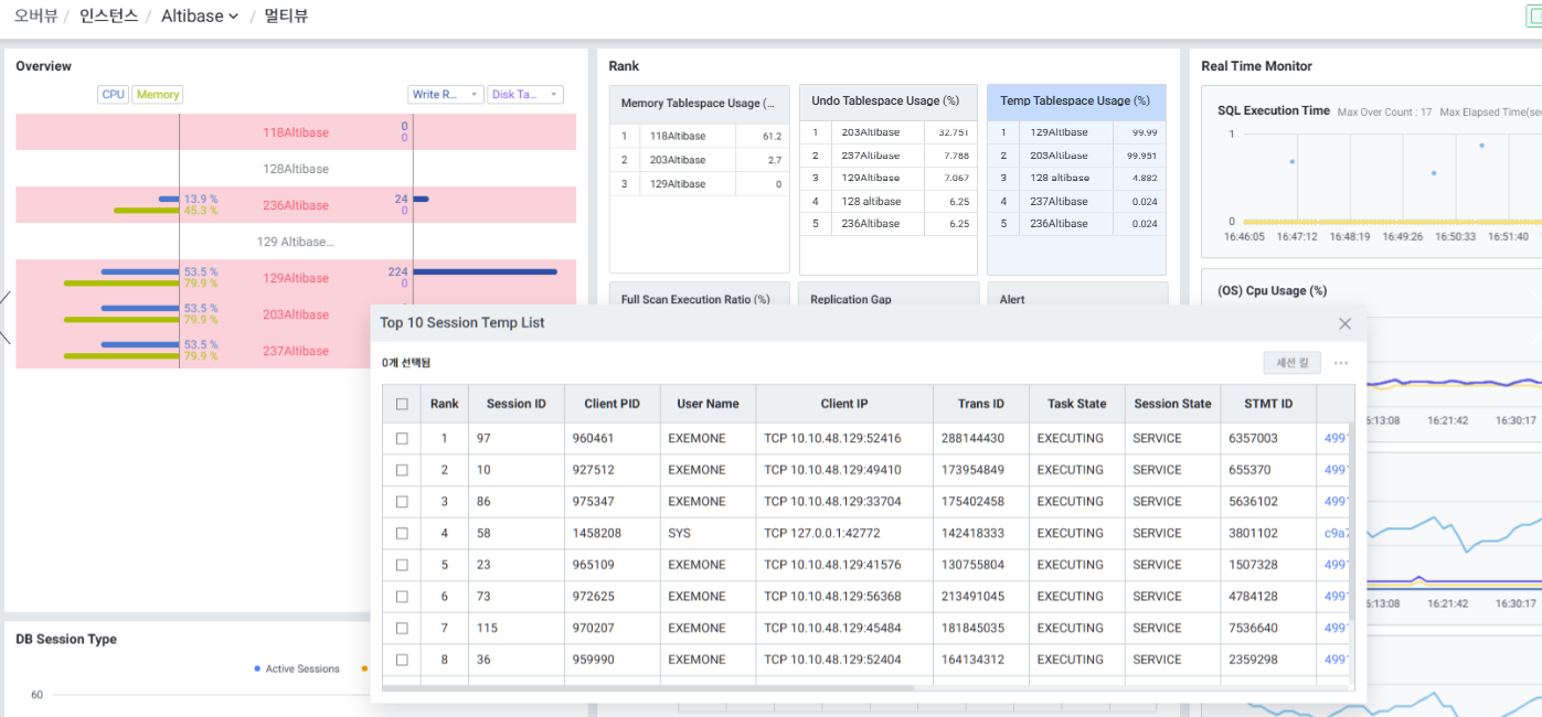 실행중인 Session 목록을 확인할 수 있습니다. 멀티 데이터베이스 모니터링을 지원하며 우측 상단에서 원하는 인스턴스만 모니터링이 가능하도록 선택할 수 있습니다.