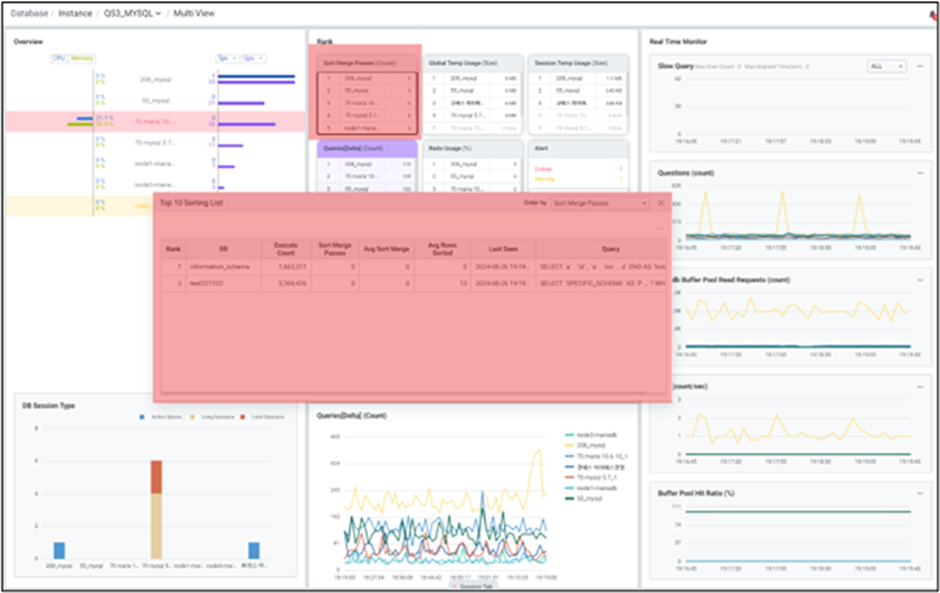 디스크의 성능은 메모리보다 느리기 때문에 실제 쿼리 요청이 느려질 수 있으므로, sort merge passes 발생여부를 모니터링하여 성능에 영향이 있는지 모니터링 해야 합니다. 인스턴스 클릭 시 sort merge passes수가 높은 SQL을 확인할 수 있는 ‘Top 10 Sorting List’ 창으로 연계 됩니다.