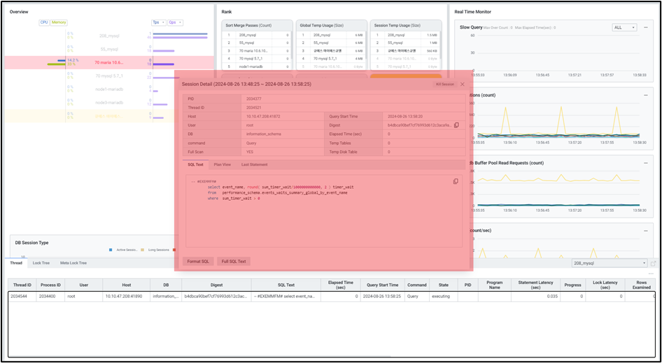 5) Session Tab Multi View 화면 하단 Session Tab 버튼을 클릭하면 슬라이드 아웃 형태로 Threads 목록을 확인할 수 있습니다. Overveiw나 Trend Chart를 통해 데이터베이스의 비정상적인 상태를 인지했을 때, Session Tab에서 현재 SQL을 실행하고 있는 Active Threads, Lock Threads 정보를 확인하여 원인이 되는 Threads를 찾을 수 있고, 필요하다면 강제로 종료할 수 있습니다.