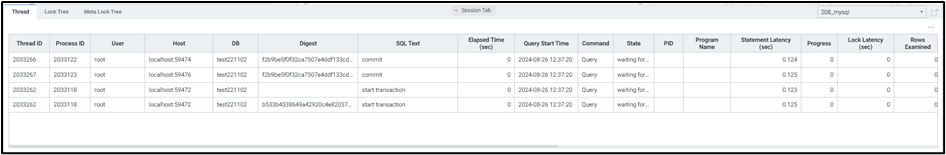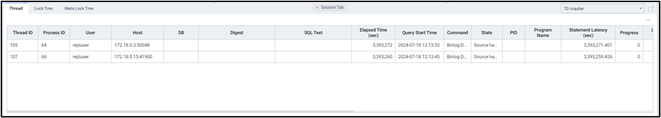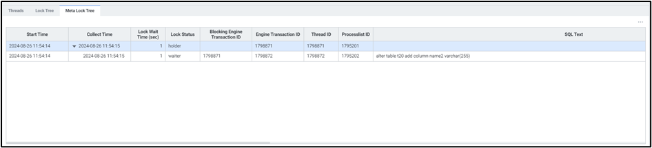 현재 Meta Lock 상태의 Threads 목록을 확인할 수 있습니다. 멀티 데이터베이스 모니터링을 지원하며 우측 상단에서 원하는 인스턴스만 모니터링이 가능하도록 선택할 수 있습니다.