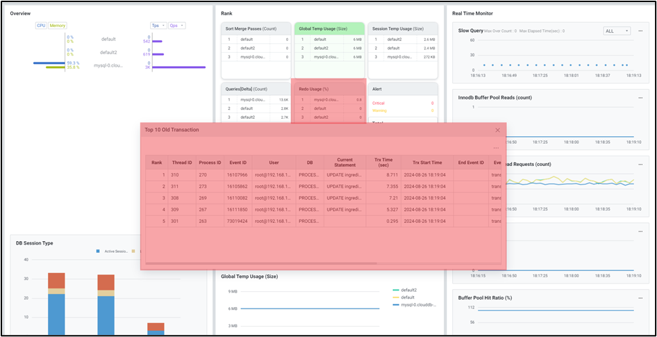 Redo 사용률을 보여줍니다. 인스턴스 클릭 시 어떤 트랜잭션이 Redo Log를 유발하고 있는지에 대한 정보를 자세히 확인할 수 있는 ‘Top 10 Old Transaction’ 창으로 연계 됩니다.