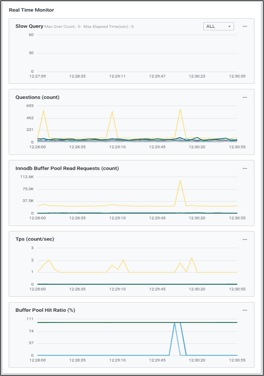 데이터베이스의 활동성 및 지연에 관한 지표들을 이용하여 Chart 형식의 모니터링 화면을 제공합니다. 기본적으로 4개의 주요 성능 지표에 대한 모니터링이 가능하며, 시스템 및 업무 특성에 따라 원하는 성능지표로 변경 및 확장이 가능합니다.