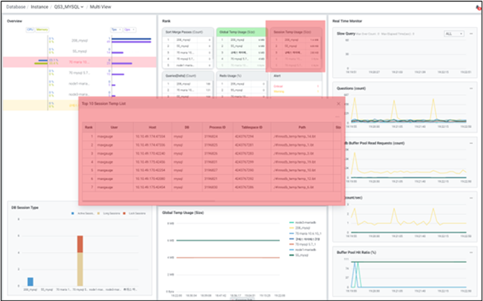 Session Temp 사용률을 보여줍니다. 인스턴스 클릭 시 session temp 사용량이 높은 파일을 확인할 수 있는 ‘Top 10 Session Temp List’ 팝업창으로 연계 됩니다.