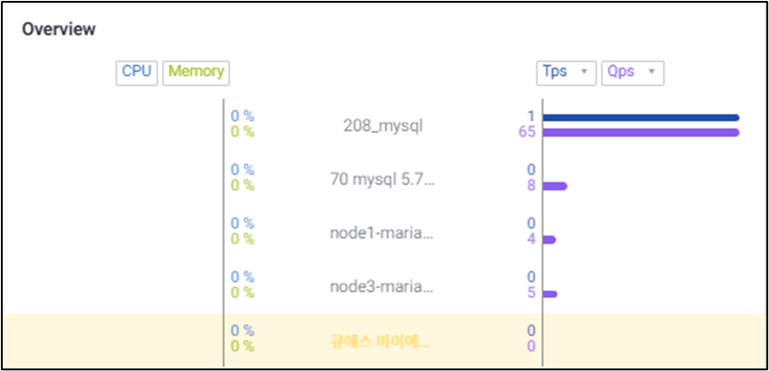 다수의 MySQL 서버를 모니터링 할 수 있는 화면입니다. 하나의 데이터베이스가 선택되면 Overview, Session, Core 6 등 선택된 데이터베이스의 데이터만으로 변경되어 단일 데이터베이스에 대한 집중적인 모니터링이 가능합니다. 상단 브레드크럼을 이용하여 폴더 변경이 가능합니다.