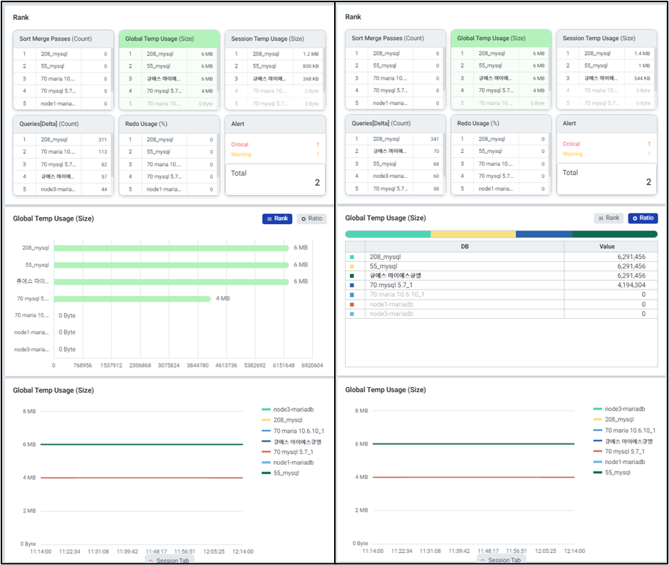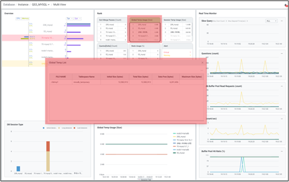 Global Temp 사용률을 보여줍니다. 인스턴스 클릭 시 global temp 사용량이 높은 파일을 확인할 수 있는 ‘Global Temp List’ 팝업창으로 연계 됩니다.