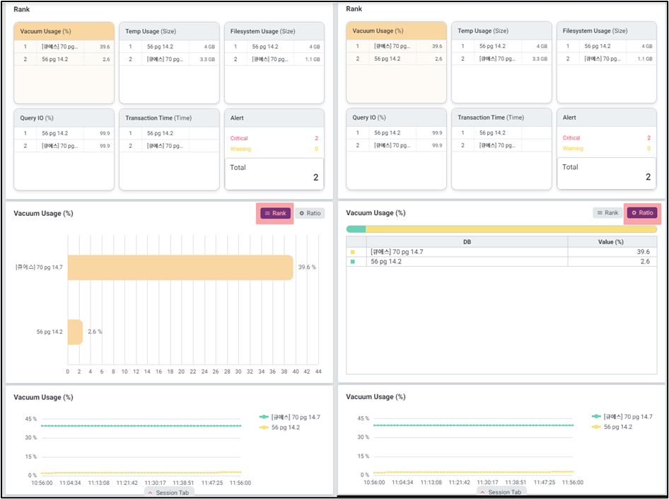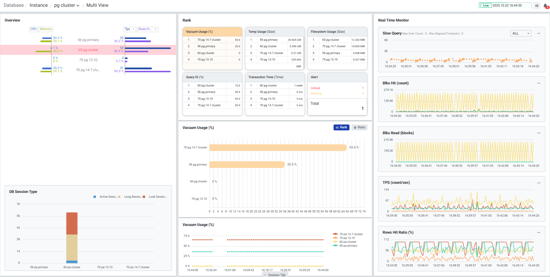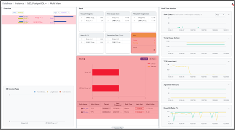 다수의 PostgreSQL 서버를 모니터링 할 수 있는 화면입니다. 하나의 데이터베이스가 선택되면 Overview, Session, Core 6 등 선택된 데이터베이스의 데이터만으로 변경되어 단일 데이터베이스에 대한 집중적인 모니터링이 가능합니다. 상단 브레드 크럼을 이용하여 폴더 변경이 가능합니다. Multi View는 Instance 관점에서의 모니터링 화면으로, 각 Instance 레벨의 지표 및 각 Instance의 내부 Database 지표의 합산값을 모니터링 할 수 있습니다.
