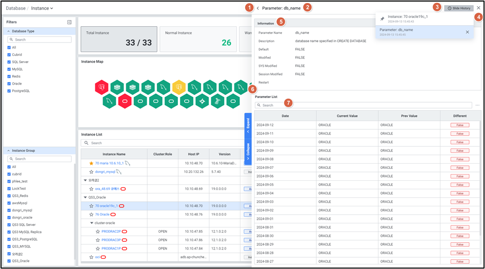 | 5 | Information | Database 타입 Oracle의 Parameter 정보를 보여줍니다. Parameter Name Description Default Modified SYS Modified Session Modified Restart |
