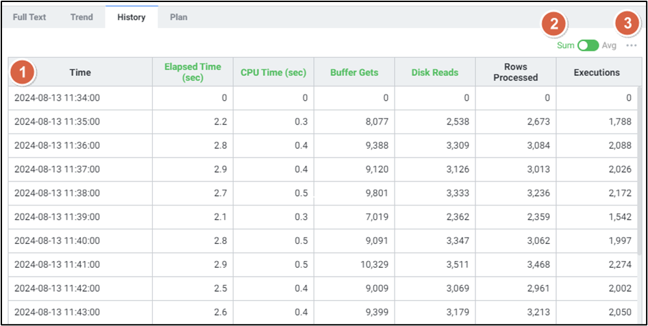 | 2 | Toggle | 우측 상단의 Toggle 버튼 클릭을 통해 Elapsed Time (sec), CPU Time (sec), Buffer Gets, Disk Reads, Rows Processed을 합계, 평균으로 변환합니다. |