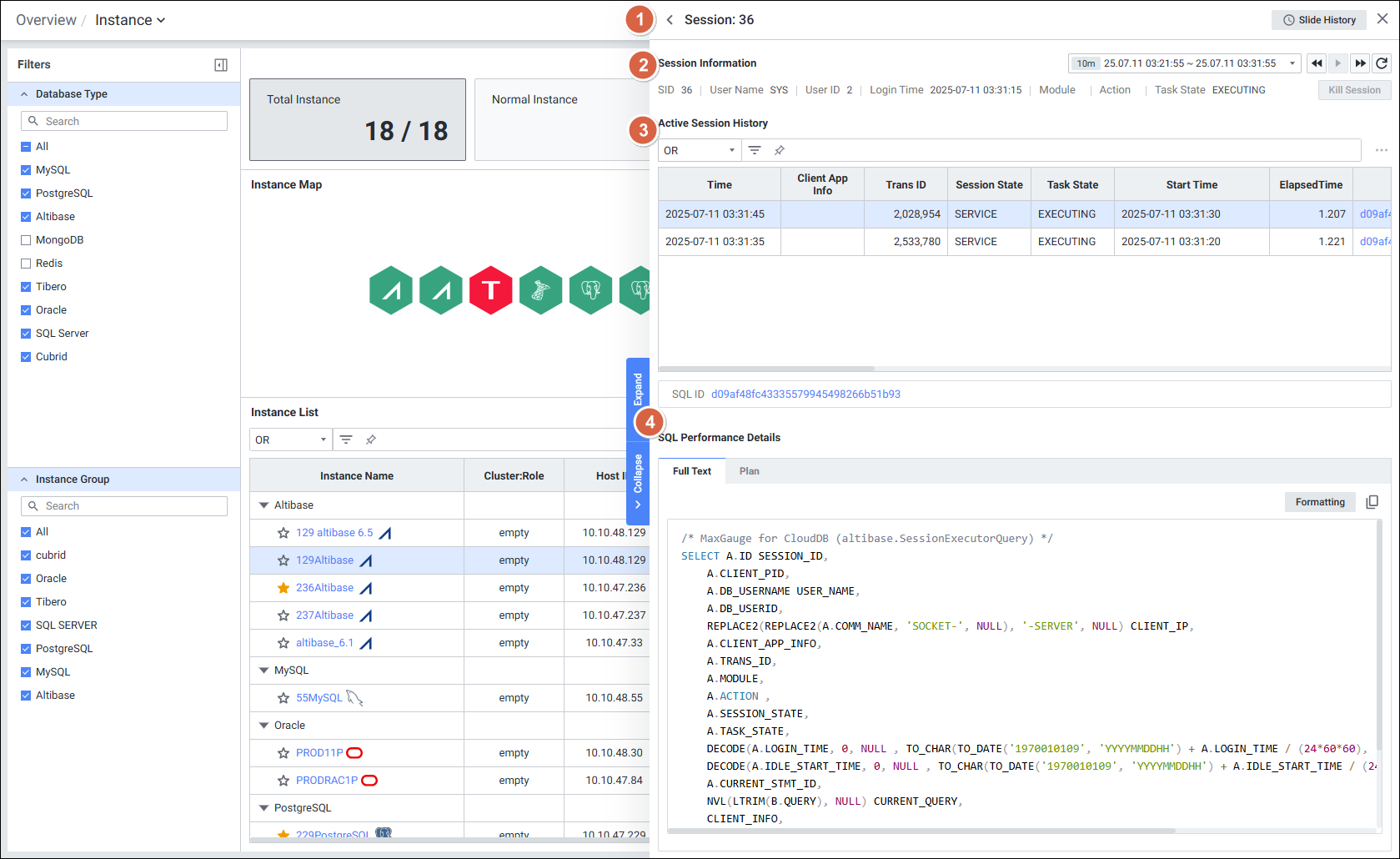 | 4 | SQL Performance Details | Active Session History에서 선택된 SQL의 Full Text와 Plan, Last Statement를 보여줍니다. |