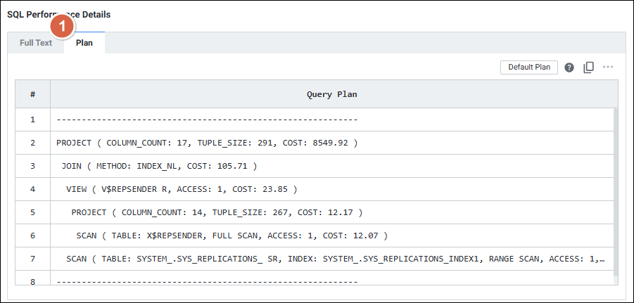 | 1 | Plan | Active Session History에서 선택된 SQL ID의 Plan를 보여줍니다. Default Plan : 모든 변수 값에 "기본 값"을 넣어 Plan을 조회합니다. Copy : |