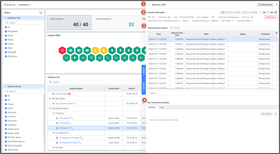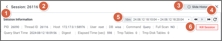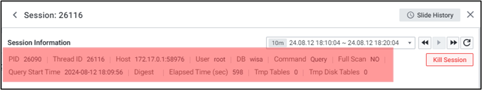 MySQL 데이터베이스 타입의 인스턴스 디테일 슬라이드에서 연계된 Session Detail Slide 화면입니다. Instance Detail Slide > Active Session > Thread ID를 클릭하여 확인할 수 있습니다.