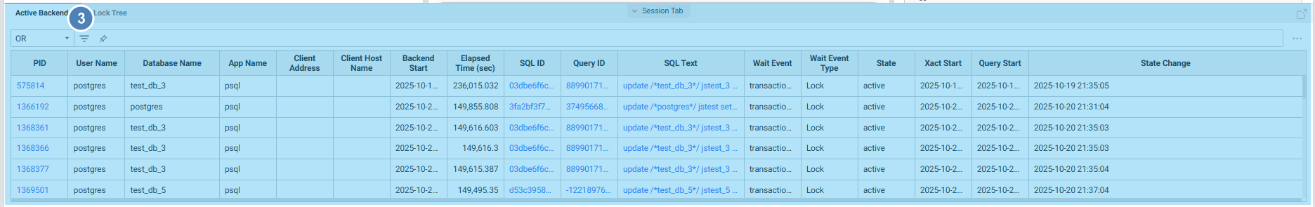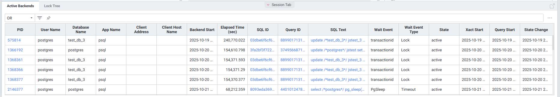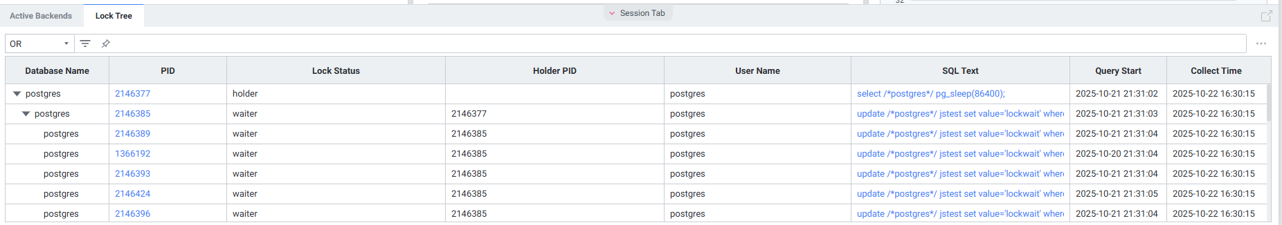 현재 Lock 상태의 Backends 목록을 확인할 수 있습니다.