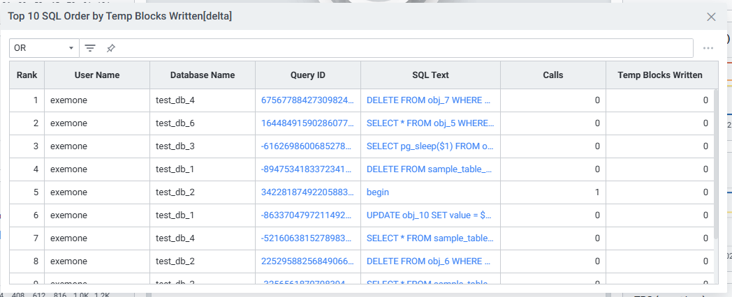 해당 영역을 클릭하면 Temp 사용량이 높은 SQL을 확인할 수 있는 ‘Top 10 SQL Order by Temp Blocks Written’ 팝업창으로 연계됩니다. SQL ID를 클릭할 경우 자세한 정보를 확인할 수 있는 SQL Detail 창으로 연계됩니다.