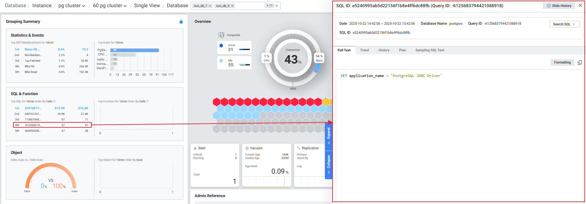 데이터베이스 지표, Event통계, SQL 실행 정보, Object scan type별 집계 등 다양한 관점의 집계된 데이터를 통해 장애 원인을 추적할 수 있습니다.