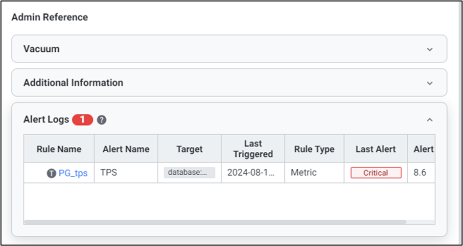| 1 | Alert | 현재 Alert 이 발생하고 있는 알람 발생 카운트를 표시합니다. 해당 영역을 클릭하면 Alert 발생 정보를 확인할 수 있는 Admin Reference 영역의 Alert Logs 항목이 펼쳐집니다. |