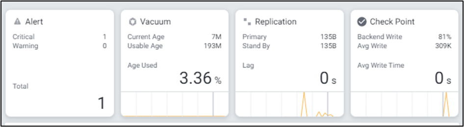 Alert, Vacuum, Replication, Check point 등 4가지의 인프라 관련 주요 관리 포인트를 표시합니다.