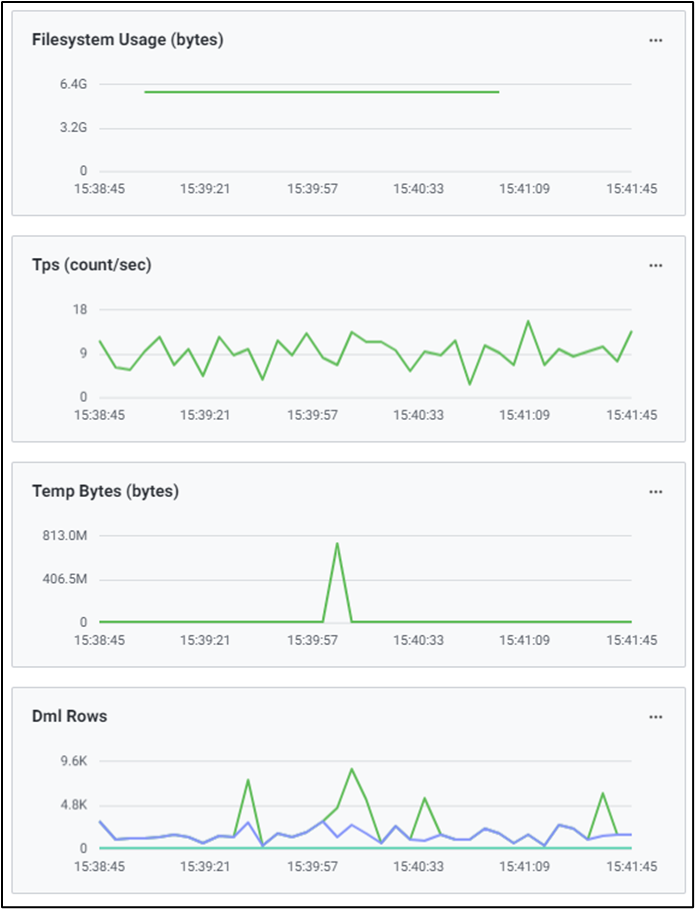 데이터베이스의 활동성 및 지연에 관한 지표들을 이용하여 Chart 형식의 모니터링 화면을 제공합니다. 기본적으로 4개의 주요 성능 지표에 대한 모니터링이 가능하며, 시스템 및 업무 특성에 따라 원하는 성능지표로 변경 및 확장이 가능합니다. (상세 내용은 11-2) Trend Chart 참고)