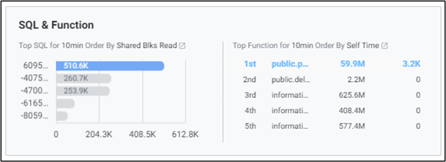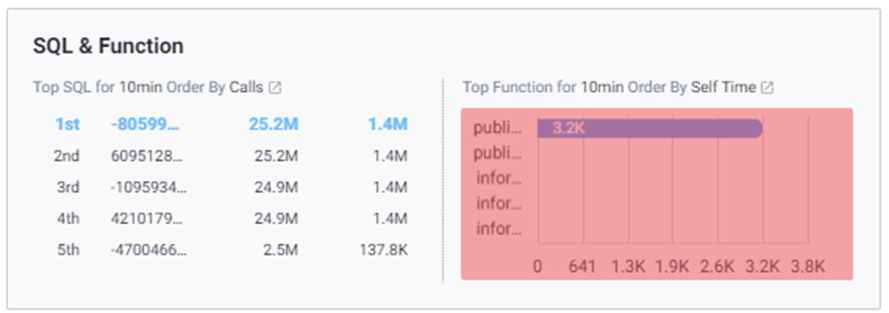 최근 10분 데이터를 비교하여 기본 실행 횟수의 변화량을 기준으로 Top SQL과 Top Function을 확인할 수 있습니다.