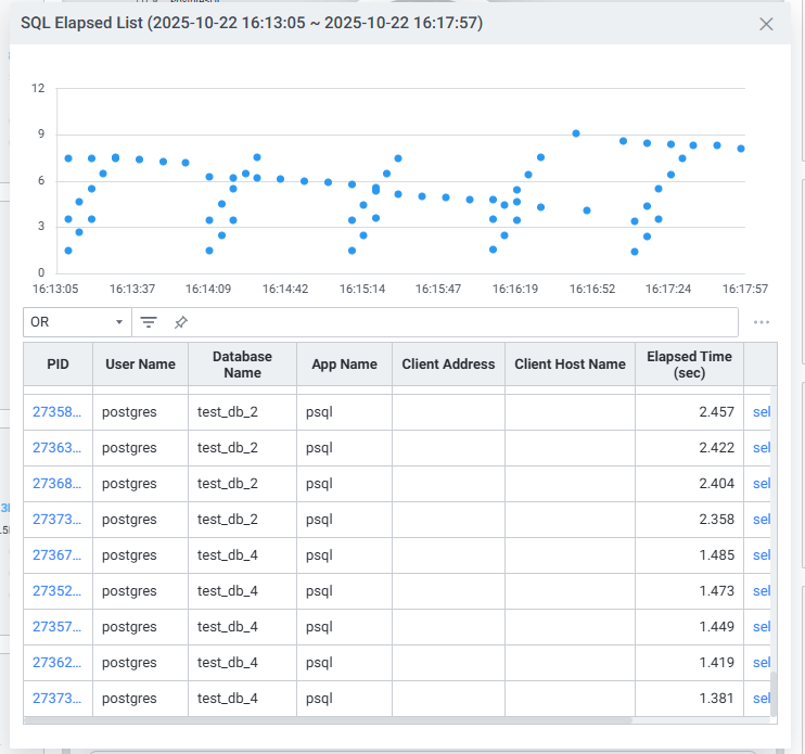 드래그 시 해당 영역에 실행된 SQL Elapsed List를 확인할 수 있습니다. PID 클릭 시 Session Detail로 연계되며, SQL Text 클릭 시 SQL Full Text 팝업창이 연계됩니다.