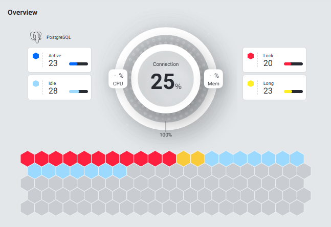 Connection View를 통해 데이터베이스의 전체 Backends가 어떻게 사용되고 있는지 사용 비율을 표현한 벌집 뷰의 색 변화를 통해 데이터베이스의 상태를 한눈에 파악할 수 있습니다. 또한 max_connection 대비 Backends가 얼마나 사용 중인지 확인할 수 있습니다.