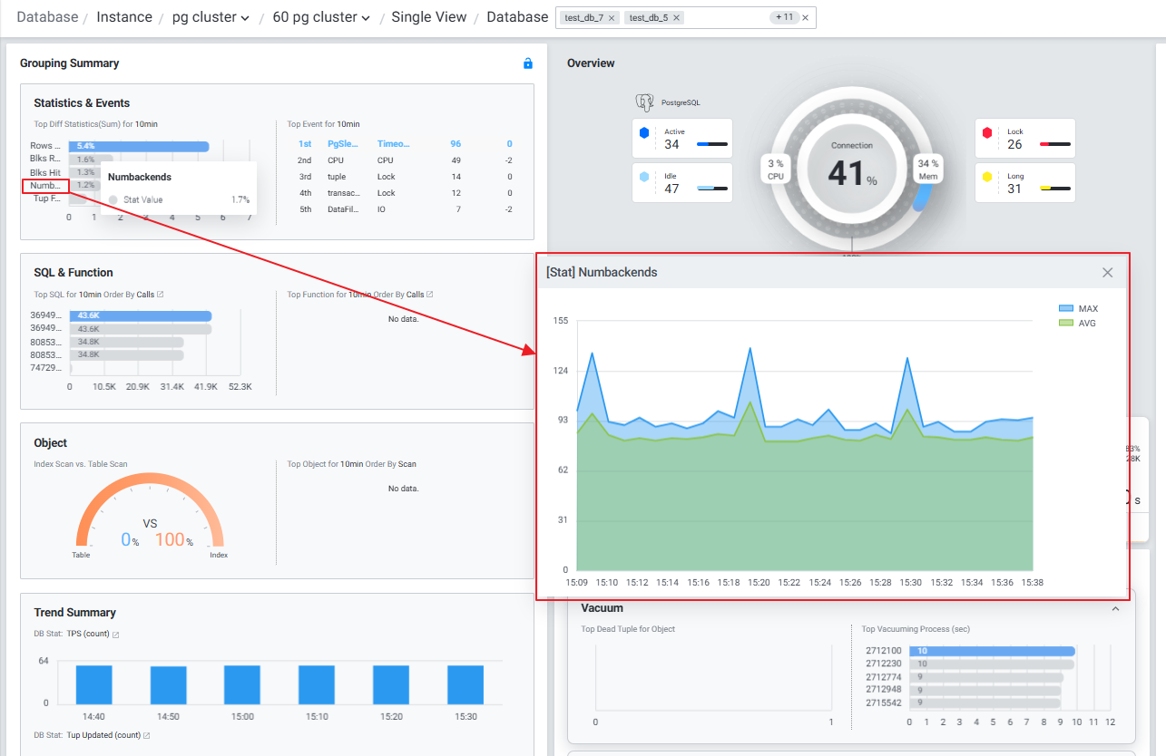 1) Statistics & Event Overview나 Trend 항목에서 비정상적인 상황을 인지했을 때, Statistics & Events 항목에서 최근 급증한 데이터베이스 지표를 확인하여 원인을 추적할 수 있습니다.