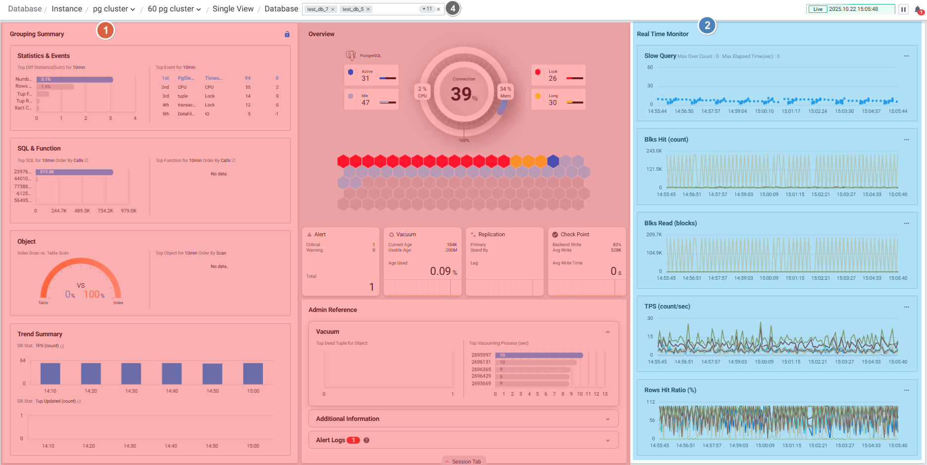 | 1 | Grouping Summary | 데이터베이스 지표, Event통계, SQL 실행 정보, Object scan type별 집계 등 다양한 관점의 집계된 데이터를 통해 장애 원인을 추적할 수 있습니다. | [고정 영역] 헤더 > Database 선택과 관계 없이 인스턴스 레벨의 데이터를 표현합니다. Instance 레벨의 수집 지표 하위 Database 지표의 합산 값 |