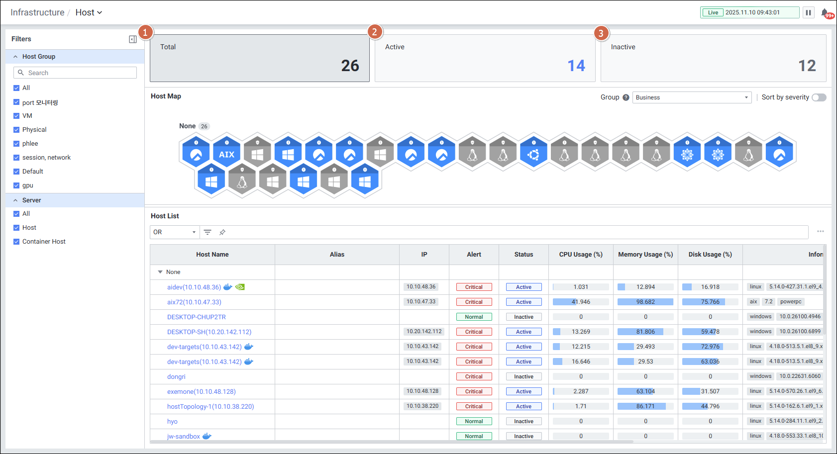 | 3 | Inactive | Inactive 호스트 개수를 보여줍니다. 클릭 시 Inactive 호스트 맵과 호스트 목록에서 Inactive 호스트를 보여줍니다. |