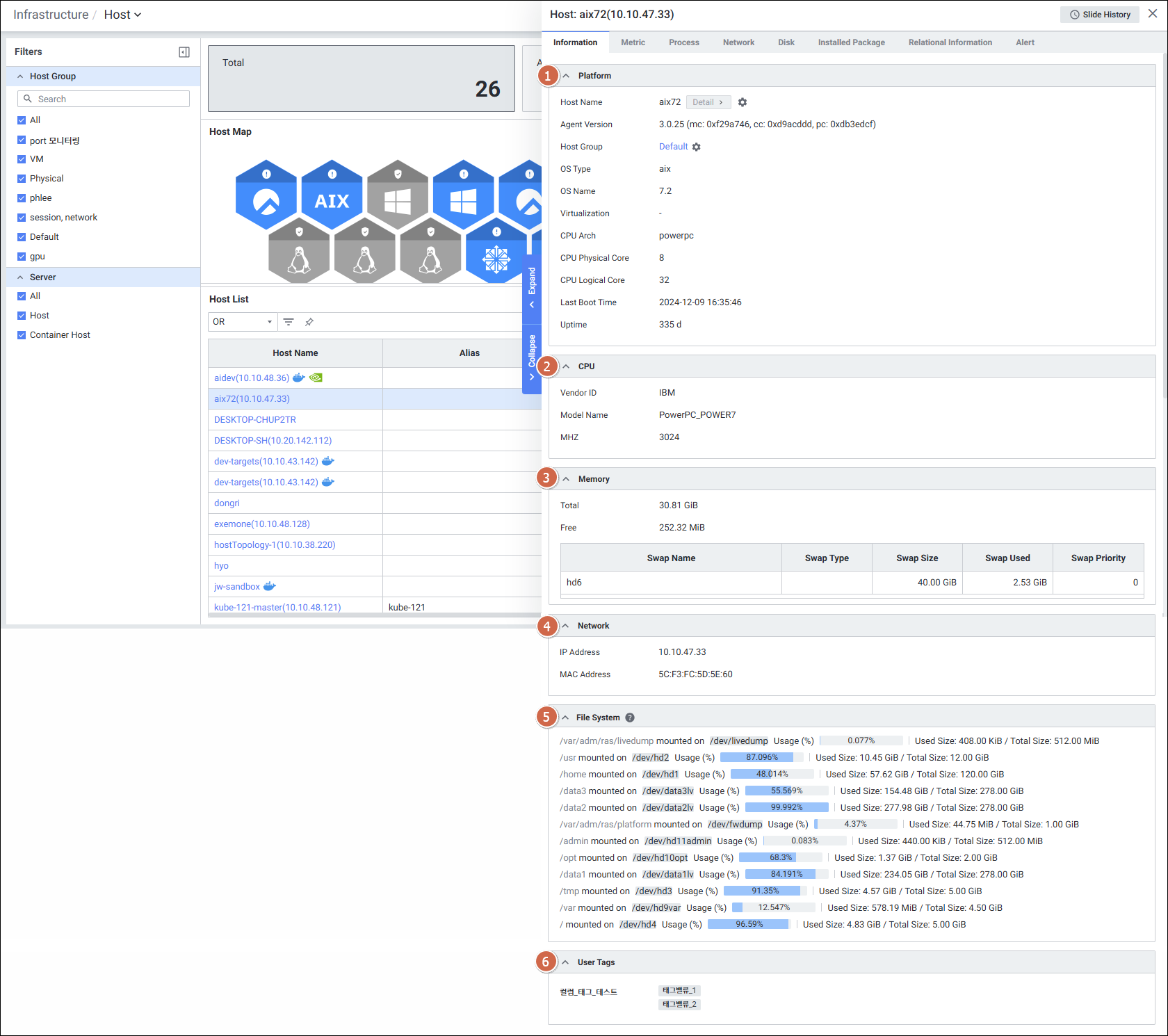 | 1 | Platform | Platform 정보를 보여줍니다. Host Name : Host 이름 Agent Version : 에이전트 버전 Host Group : 호스트 그룹 OS Type : OS 타입 OS Name : OS 정보 Virtualization : 가상화 CPU Arch : 아키텍처 CPU Physical Count : Host의 물리 코어 수 CPU Logical Count : Host의 논리 코어 수 Boot Time : Host가 최초 기동 된 시점 Uptime : Host가 기동 된 시점으로부터 경과시간 |