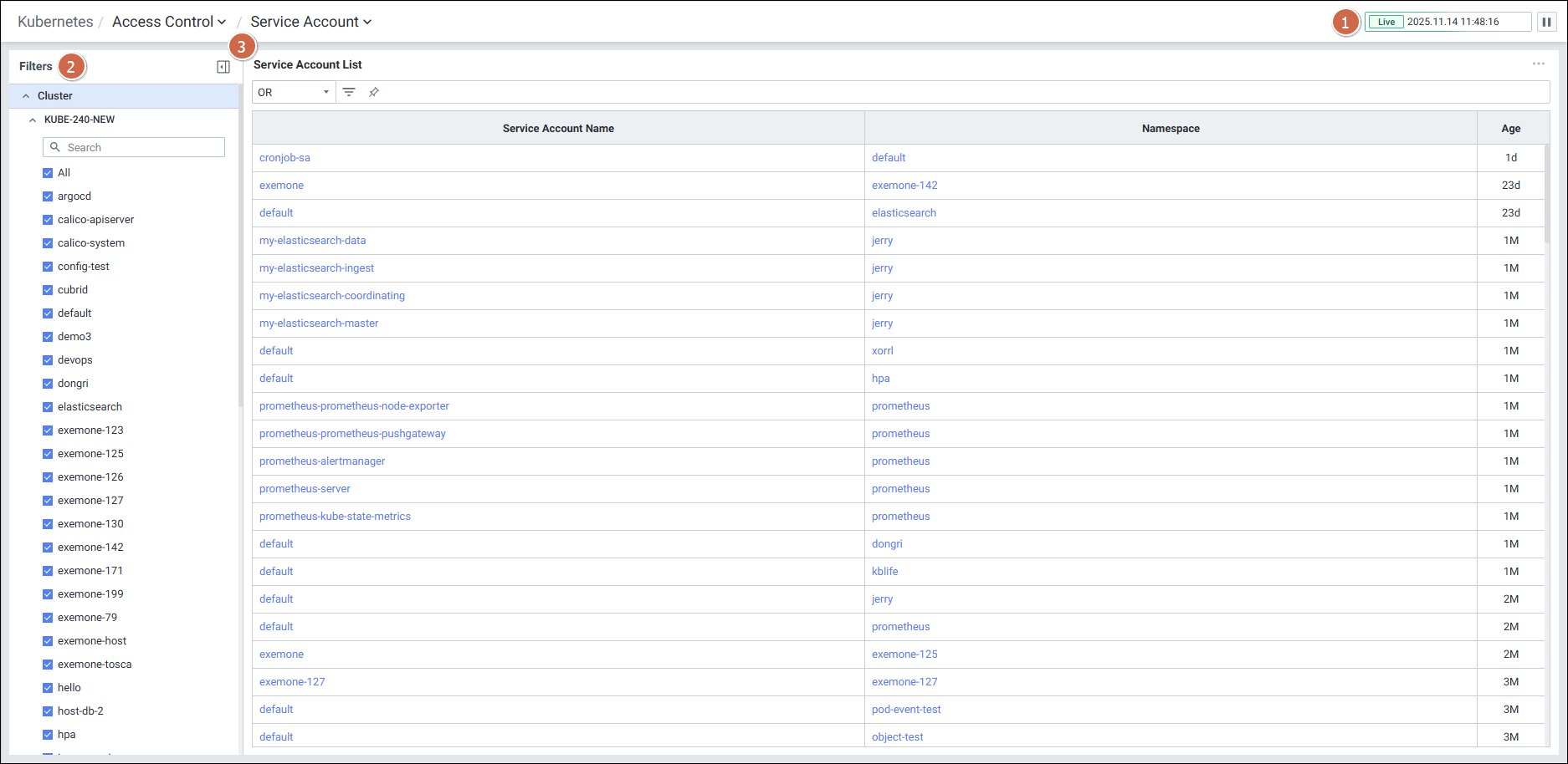 | 2 | Filters | Service Account 화면의 필터 항목을 선택합니다. |