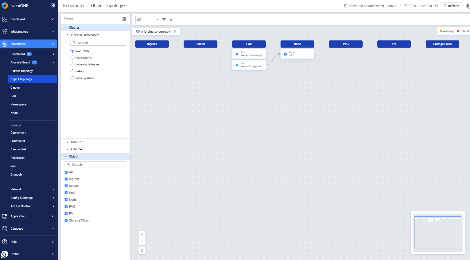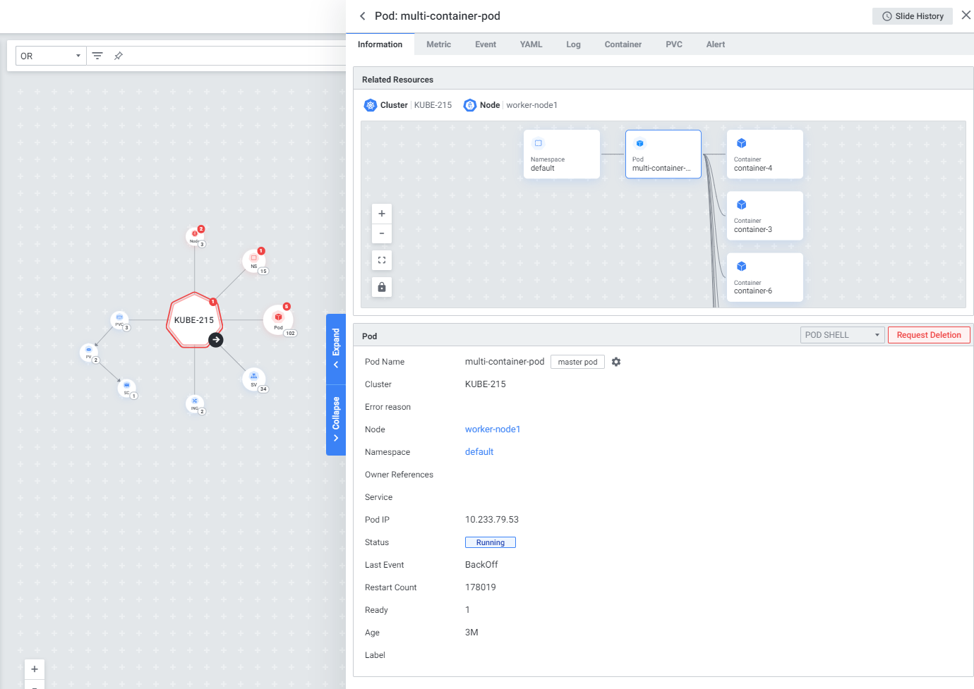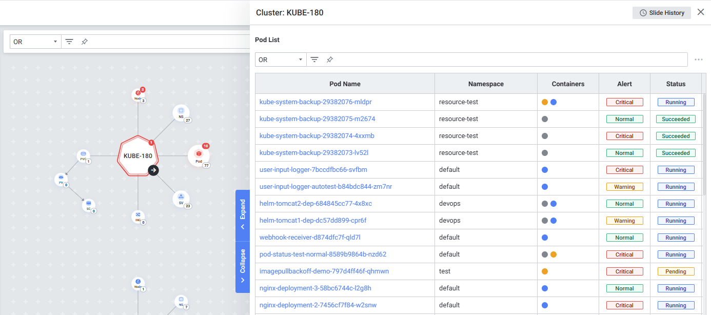 | 4 | Object List | 클러스터를 제외한 객체 영역 클릭 시, 해당 객체에 대한 목록이 detail slide로 표시됩니다.![]() 목록의 객체 Name 컬럼 데이터 클릭 시, 해당 객체에 대한 디테일 슬라이드 화면으로 전환됩니다. ![]() |