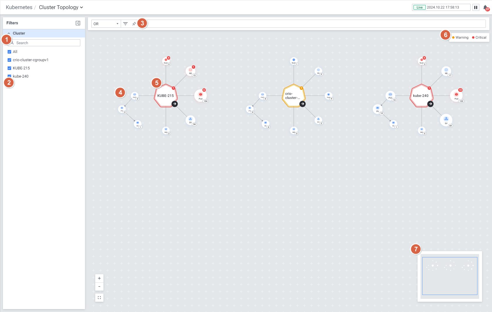 | 7 | Topology Map | 등록된 전체 클러스터의 토폴로지 뷰를 도식화하여 표시합니다. 화면 이동 또는 확대,축소에 따라 포커스가 변경됩니다. ![]() 확대/축소 및 원위치 이동이 가능합니다. |